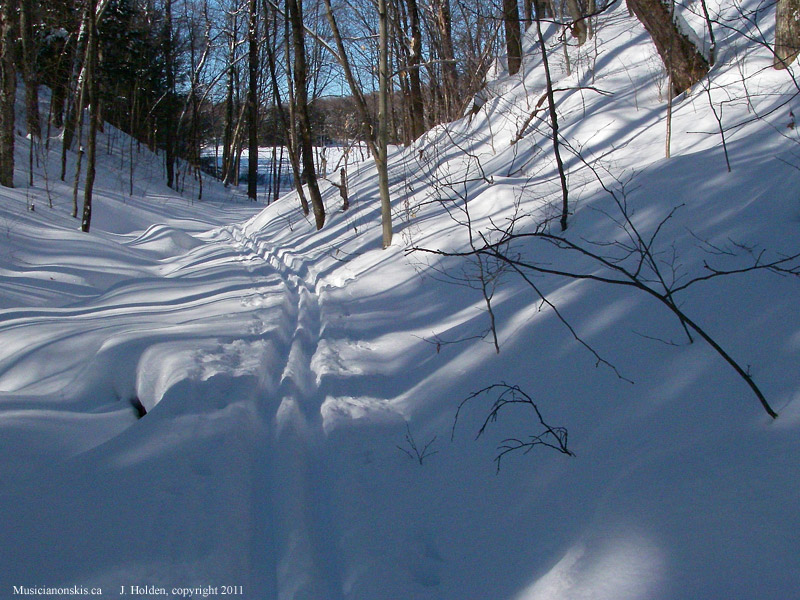 Two photos today. Such a gorgeous day after all that new snow! Parkways, Ridge and Burma were beautifully groomed and the ungroomed back trails were looking pretty stunning, too. This is a very tame section of trail 11.