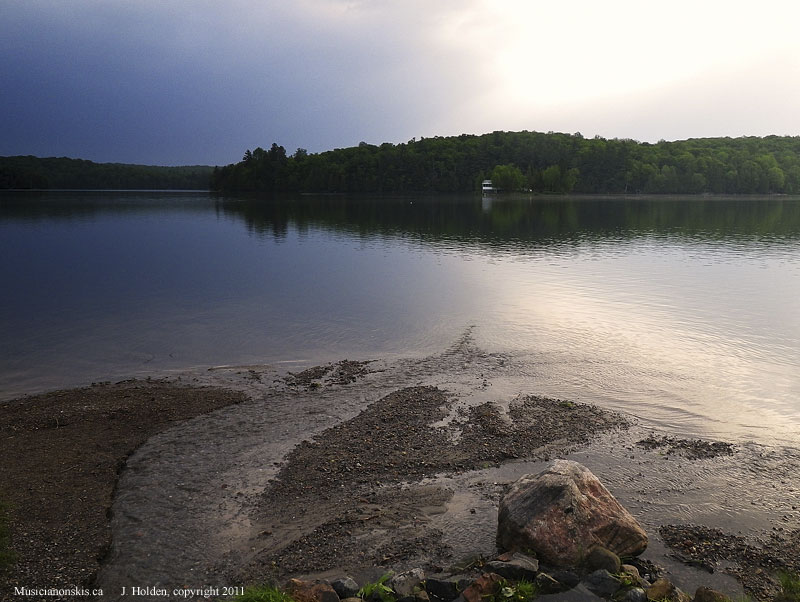 Meech Lake at 7:30 a.m. These ominous clouds retreated and blue sky appeared. There seemed to be no bugs at all today. Possibly fried, then drowned yesterday?