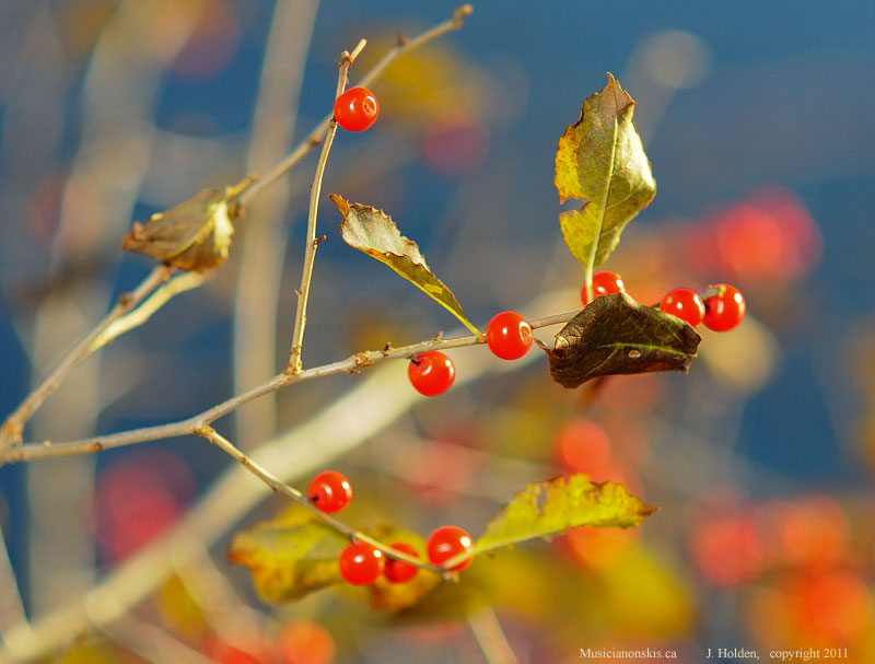 These berries are bright accents around the shore of the lake – anyone know what they are?    There are two photos of them.