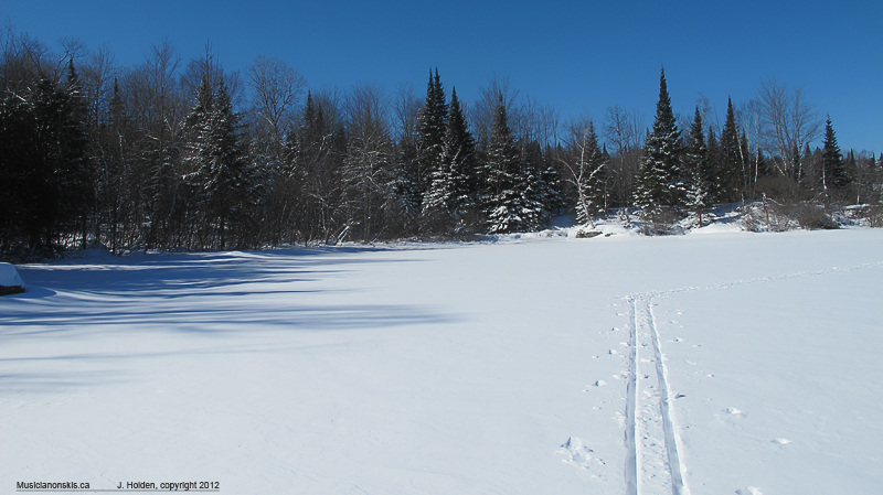 A morning tour of the lake was a highlight of the trip. Fresh snow, tracks by only one skier (me!) and complete peace. Nary a chainsaw was heard. There are occasionally snowmobilers on the lake but they never seem to rouse themselves before late afternoon. Non-motorized activity is unheard of around here. No one swims, walks, snowshoes or skis. Because of this, it is largely deserted if you go out before 4:00 p.m.
