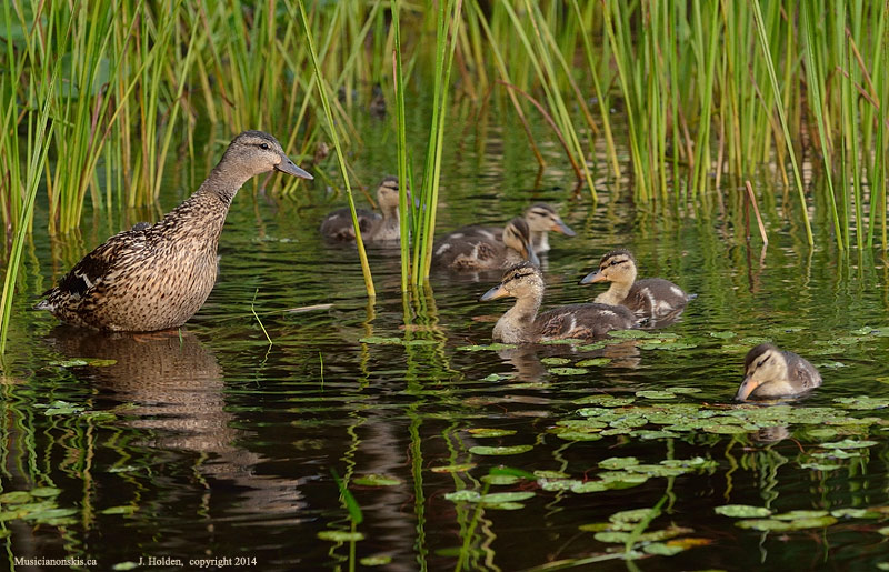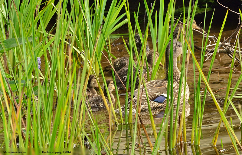 A mallard mother and her 7 ducklings making slurpy rounds through the yummy shoreline weeds.  As common as these ducks are in town, we have rarely seen them at Lac Champagneur.
