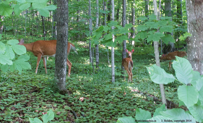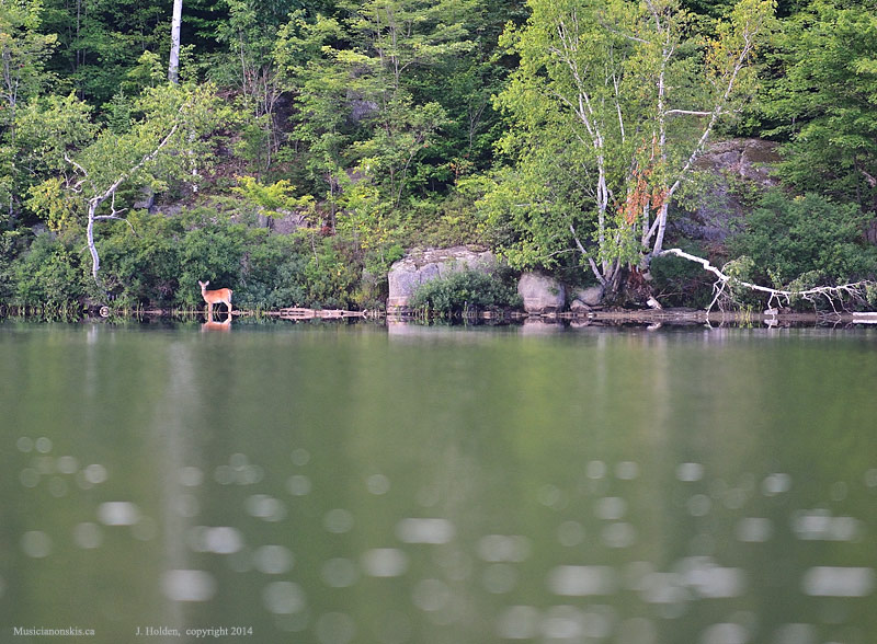 Solitary dusk deer, Lac Champagneur – a photo from last week.  Today we saw 4 fawns –  two with their mother near Black Lake  and another family in our back yard.   Do watch out if you are driving or cycling in the park, and consider slowing down.  The deer are browsing the edge of the parkway.  The young one are VERY PLAYFUL and  CURIOUS, especially when cars and bicycles go by.     (Have a great week – I’m off to the White Mountains!)