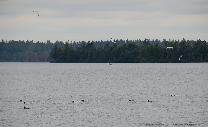 Not the greatest photo, but interesting to see:  we counted 35 loons at one point (some were under water) and as you can see, there were gulls getting into the action as well.  This was taken from “Pine Island” on Opeongo, where we stopped for a chilly lunch.