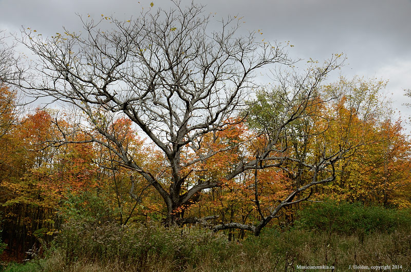 Yeah it’s a great old tree – a remnant of the McKlusky (sp?) family’s farm. There’s quite a few signs of their stay up there off trails 18, 20, & 21. Have you seen the stone fence that crosses #21 between #20 and the pond – it’s quite visible when there’s no leaves – it’s an eloquent example of what a hard life they led. Regardless, they must have found it hard to leave when the park bought them out.