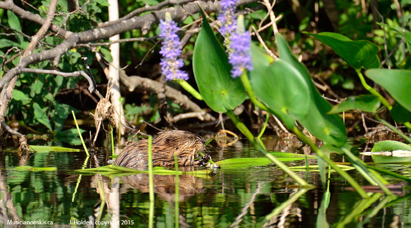 First a tall piece of pickerel weed appeared to swim by ! It was attached to this muskrat. Judging from the occasional wiggling weeds and the chewing noises, its mate was close by.