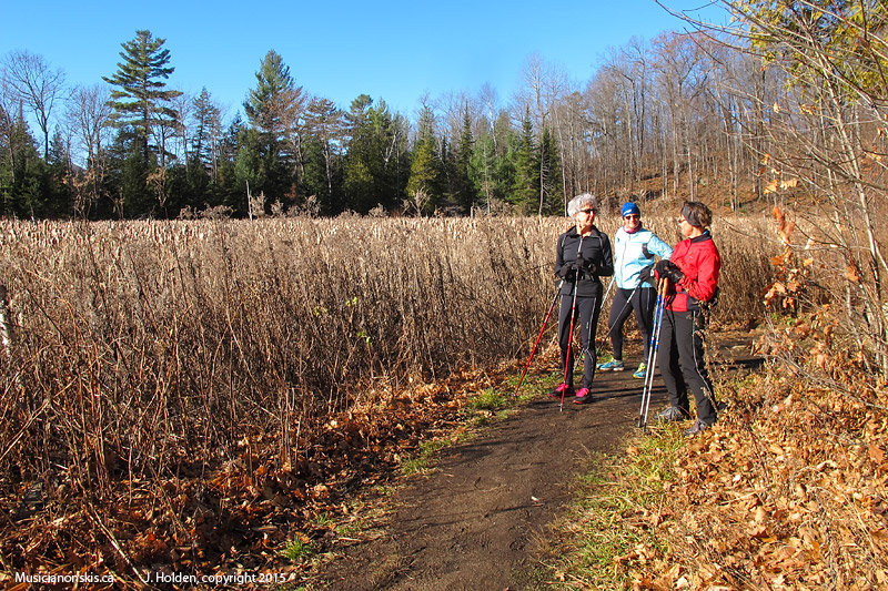 Brilliant sun balanced by brisk breezes, temperature of plus 2 by late morning. Perfect weather to be out on the trails. (The only improvement would be a 10 cm snowfall and cooler temperatures. )