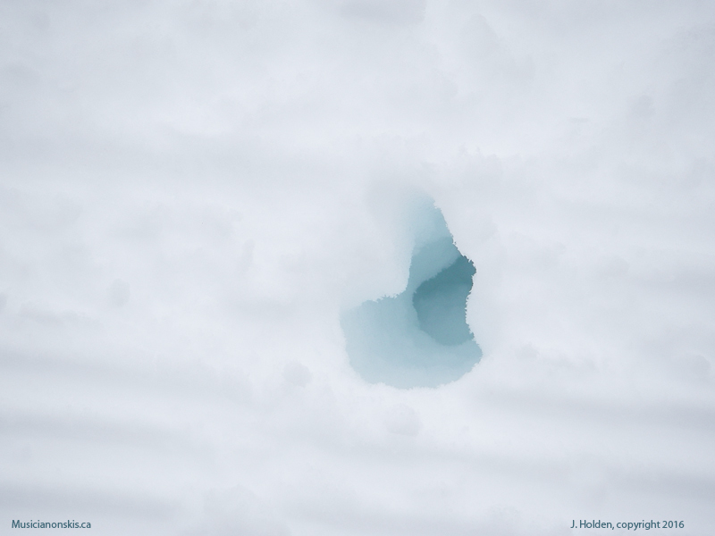 This is a pole hole in the soft snow.  Any science geeks out there know why the deep, powdery snow looked blue today?