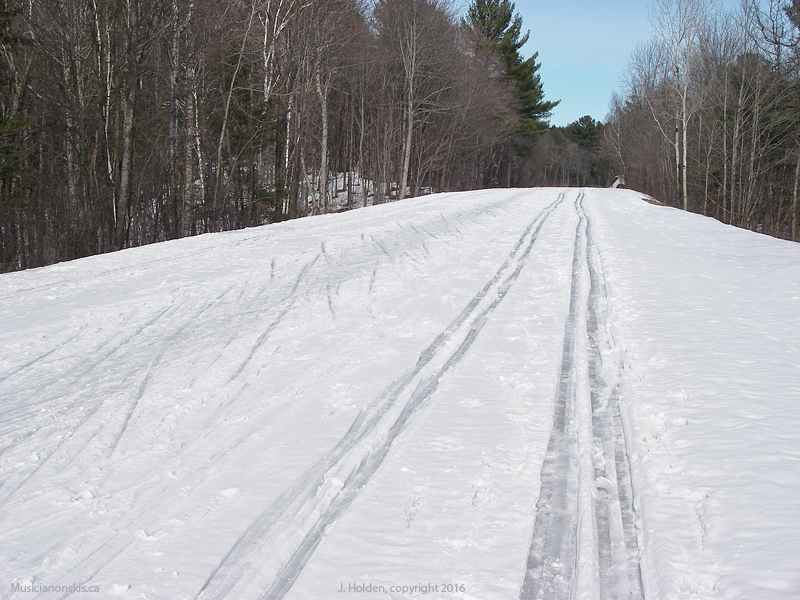 The weather and fresh dusting of snow was so nice, I went back for a short afternoon classic ski on the very sun-abused north loop. This is a testimonial for klister because it worked on solid ice, slush, granular snow and even when the skis were submerged under water. The icing sugar snow was slow, the ice was noisy!