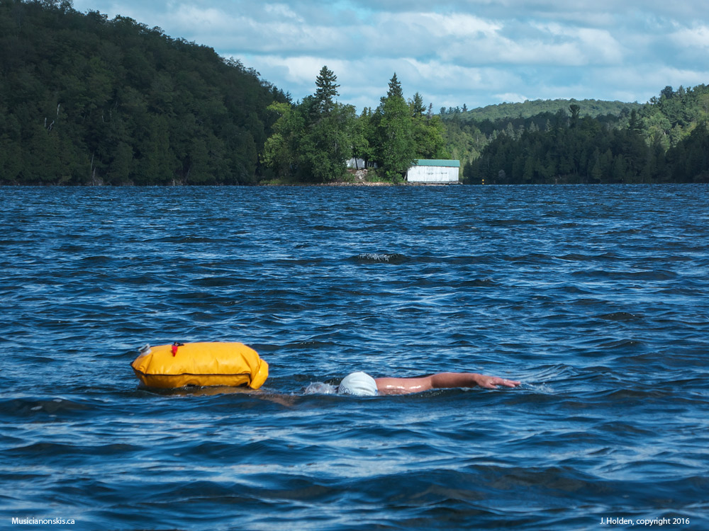 My friend Mary Lou setting out on a late-summer swim from Blanchet beach to O’Brien. Great weather for a long swim. There were even tailwinds.