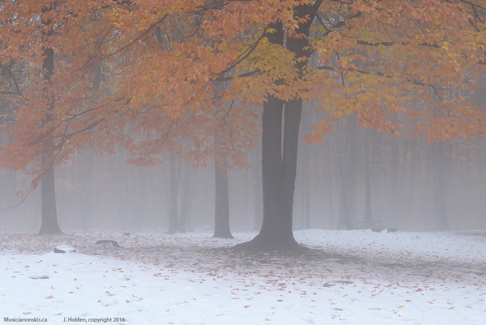 An old friend revisited again today.  I first discovered this beautiful tree during a rain storm on Oct 11, 2006.  It was the only tree that still had leaves, and seemed to be  at the same stage of colour as it was today.  That was 18 days earlier than this year’s photo.   THE 2006 PHOTO