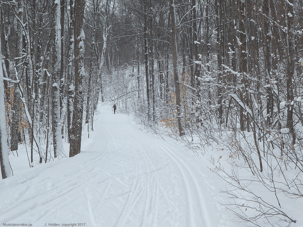 It feels like winter has begun anew. Fresh snow and cold temperatures. It snowed lightly most of the day, making for soft, slow skiing. It was a welcome change from all that hard-icy stuff. We started late afternoon and met only two skiers until the final descent to the car when the dinner/evening crowd was setting out.