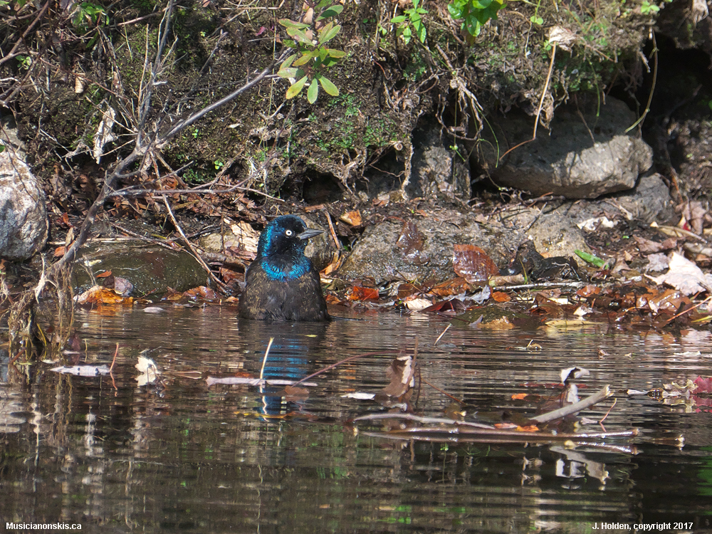 Single grackle contemplating a bath while a “plague” (according to Birdipedia) of his/her compatriots cavorted in the nearby bushes – hundreds of them..