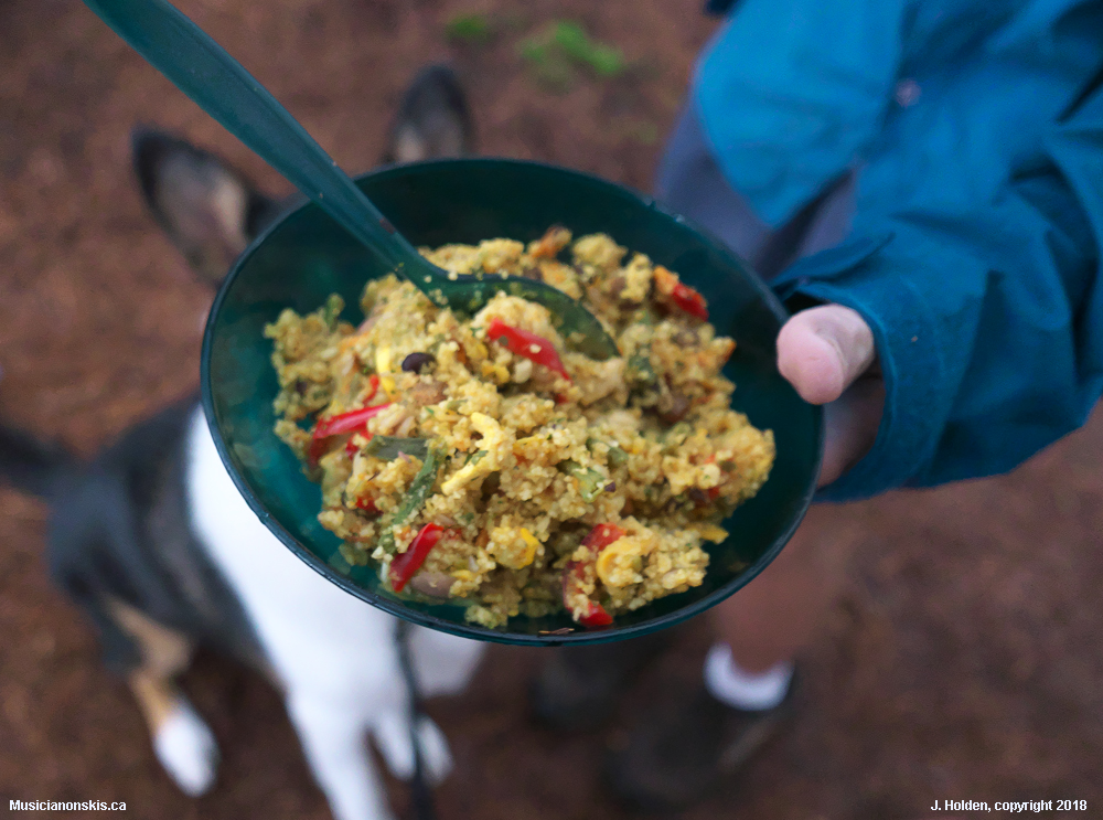 Some breakthroughs in homemade camp meals: nutritious, they use little fuel, and are easy to clean up (ie not stuck to the pot or burnt). This one is Mediterranean Couscous with dehydrated veggies.