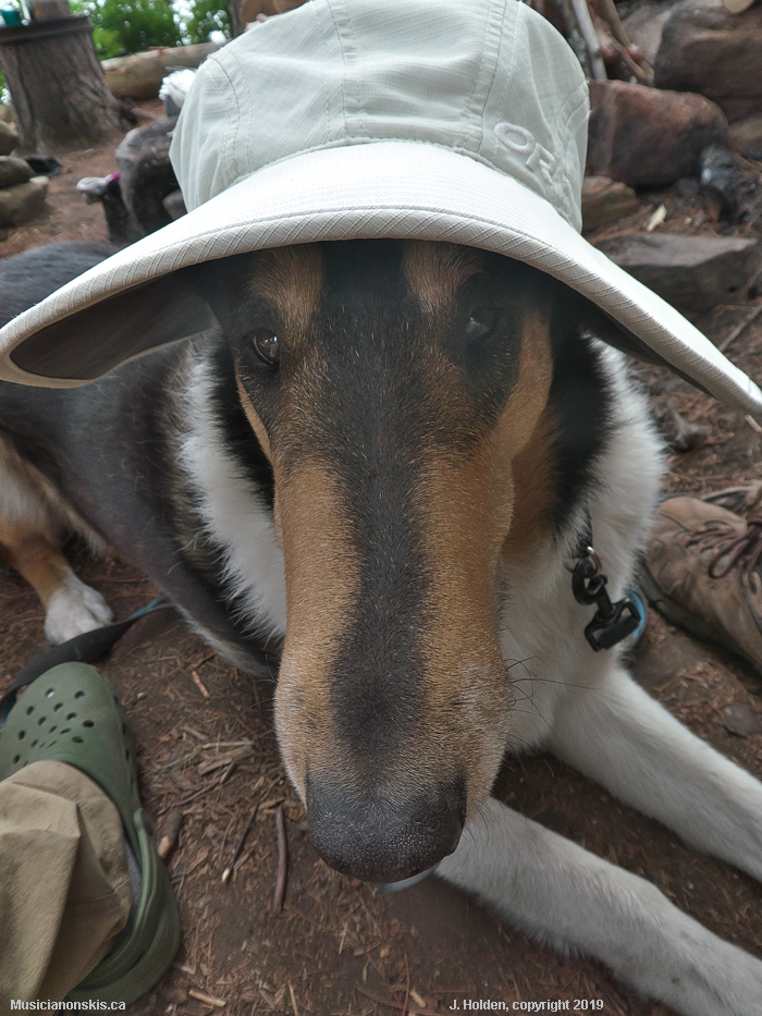 A squirrel baffle is the inverted dish that keeps squirrels out of a bird feeder. In Torin’s case, we hoped the sunhat would keep his gaze from the squirrels.