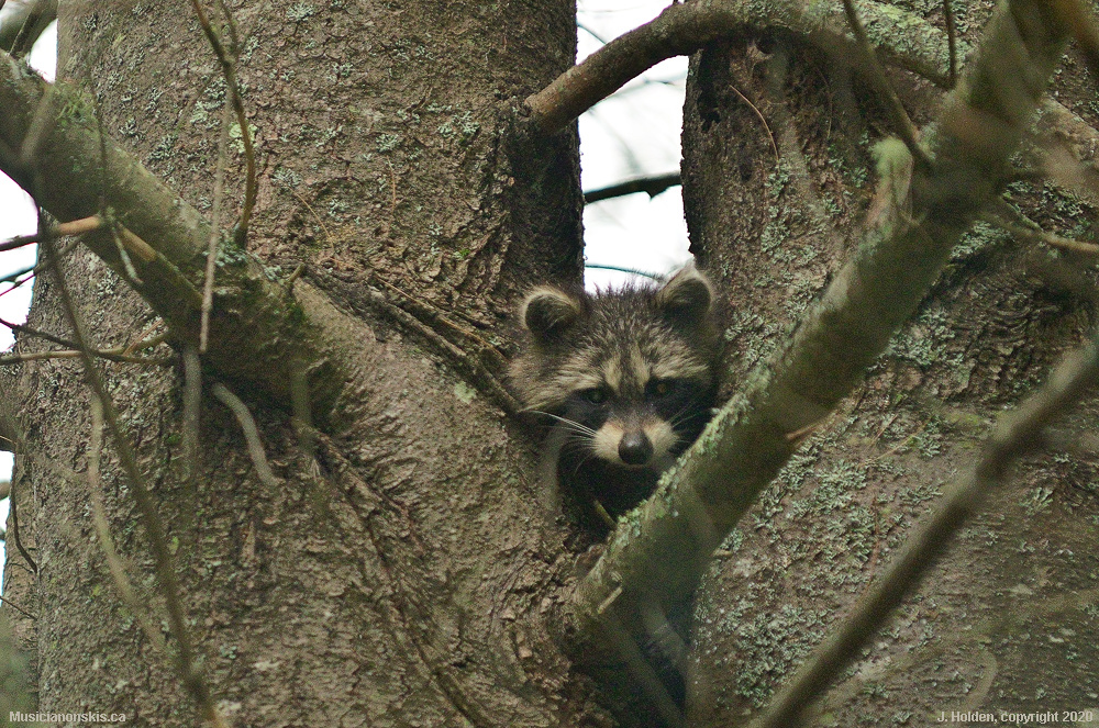 Extremely wary forest resident. Hard to tell in the photo, but he is very high in the tree. It’s the first raccoon we have seen in years.