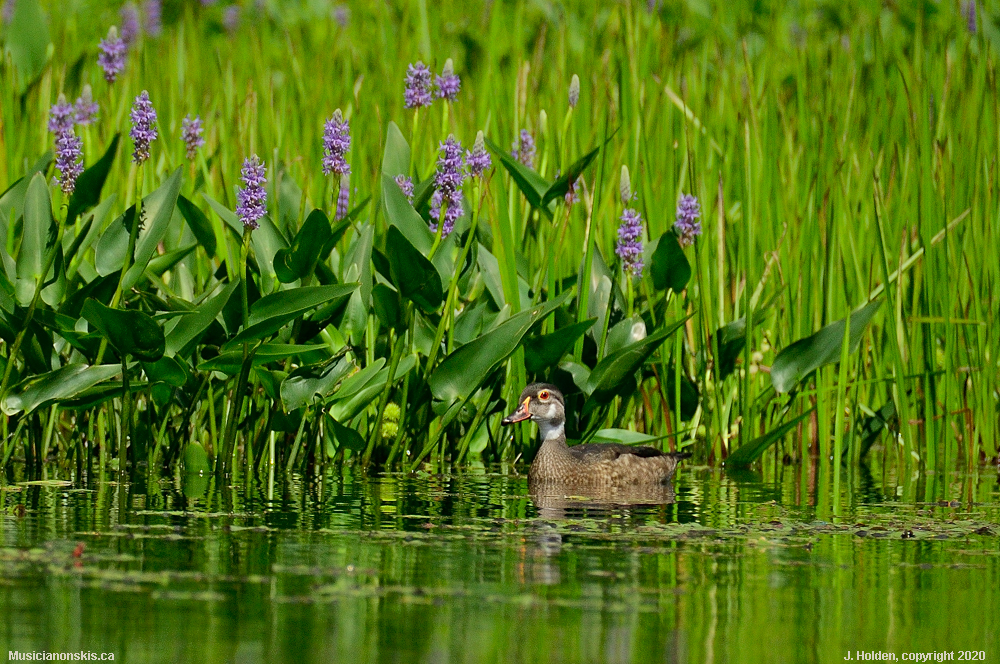 Glory Hallelujah! Not a mallard! It’s a shy wood duck – in the pickerel weed of course. In case you haven’t noticed this was pickerel weed month. It’s invasive but very nutritious for wildlife. (photo from mid July).