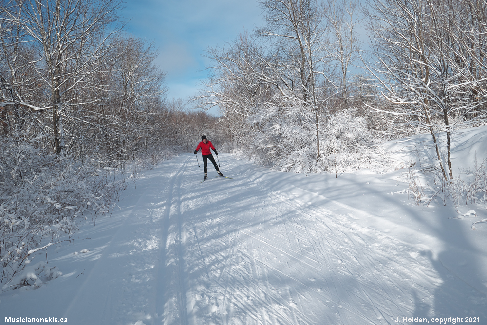 Wintry conditions – awesome for classic today!! (There were many more skaters this morning than classic skiers, which I found very odd. ) We have been at minus 1 for so long that it was tricky to remember how to dress for minus 11. I love this colder weather! Photo was taken on Ridge, not far from the lookout bench.