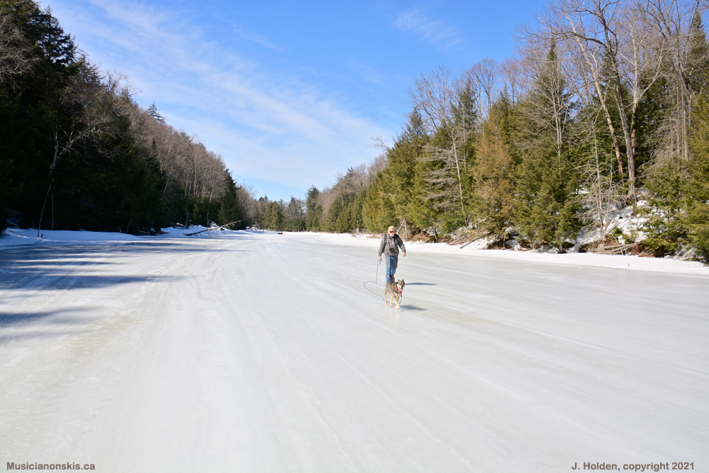 Our hike crossed this lake, Lac Alphonse, a couple of swamps and some very hilly terrain above the Rouge Valley. It was all made accessible by a snowmobile route. Perfect timing, too, as the trails softened and the lake started melting later that afternoon. This is my brother Jim, with his dog Molly.
