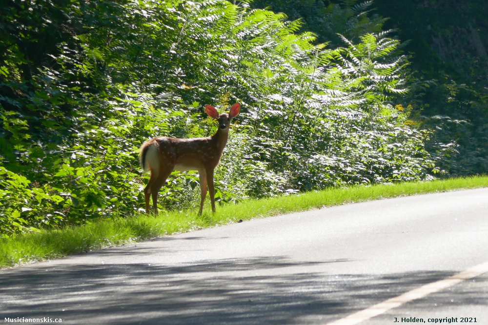 Part 1 of 3: While cycling near Kingsmere I suddenly noticed a frisky fawn racing on the grassy margin beside me. As soon as I stopped, so did he.