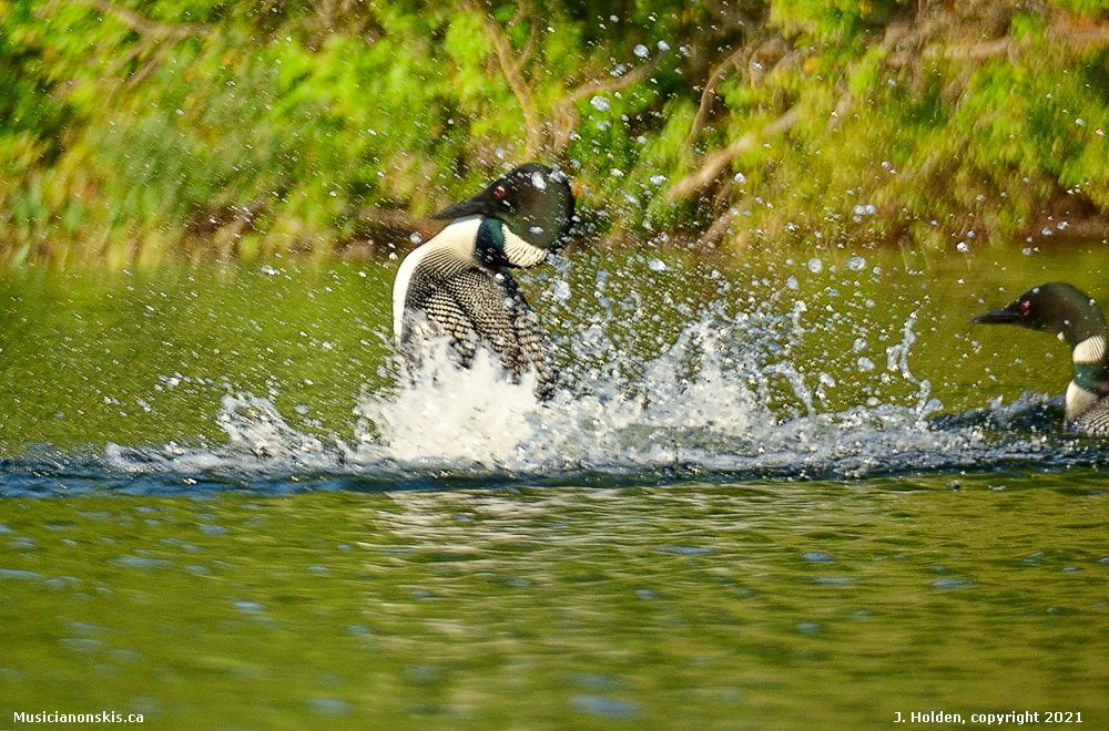 Today 4 of them exploded after some noisy yodeling – spinning their wheels vigourously enough to be completely out of the water for several seconds – more energetic and brief than the usual, long runway take-offs. Are these sprints intended to build fitness for the migration or for battling for a mate? Such interesting birds!
