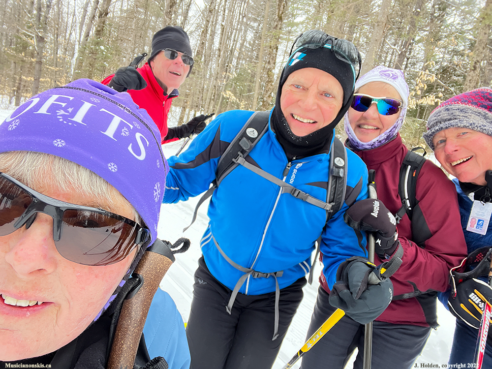 An AWESOME ski today on the “Lollipop” (Trails 53 and 51). Perfect conditions, perfect wax and perfect company. The selfie was a hoot, I need to practice these more – our sixth person is missing from the photo!