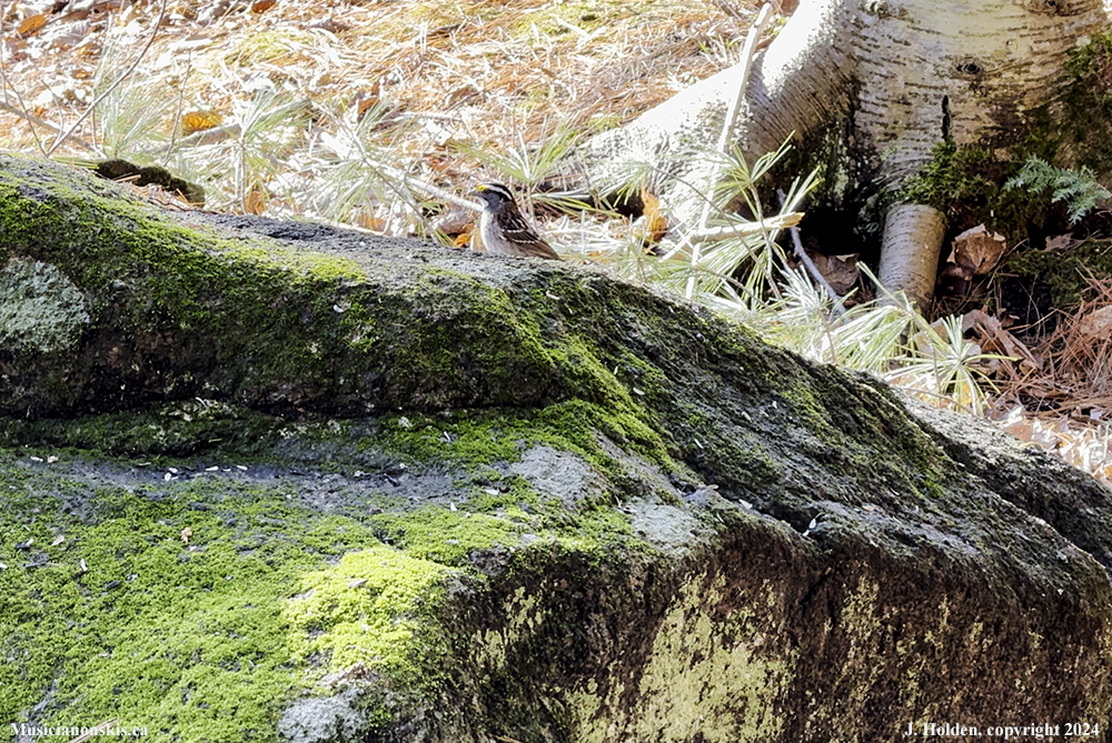 One of a flock of white-throated sparrows that are making themselves at home.