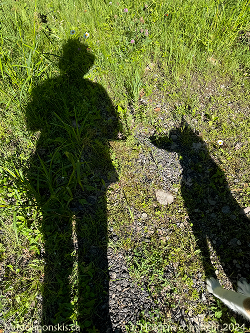 An earlier than usual morning walk, too early for the expected deerflies. At Lac Champagneur the last road is very rough and hilly (too steep for the town to take over), so Loki gets to run off leash there and also in the woods. It is a joy to see him fly, but no matter how fast he goes, he knows where I am at all times. He is the most tuned-in and playful dog ever, and I’ve had many wonderful dogs.