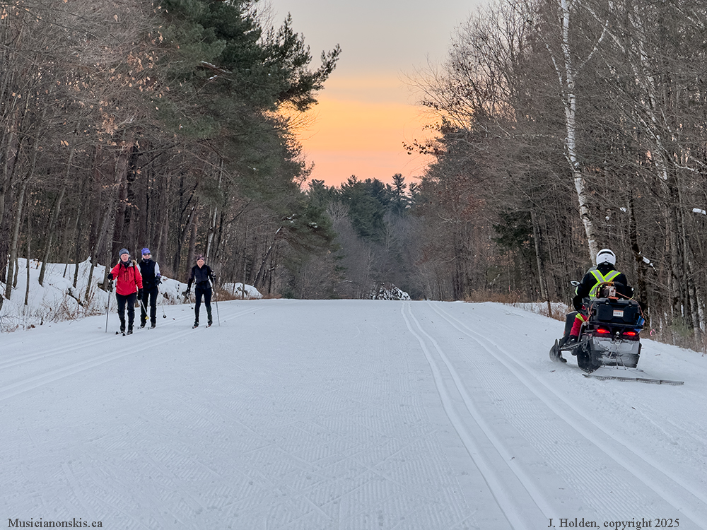 You are right that the grooming machine is much larger. This is just a snowmobile during errands, perhaps outhouse cleaning or some kind of maintenance. My friend pointed out that she didn’t notice the usual noxious fumes when the vehicle passed by, so we were wondering it is was electric.