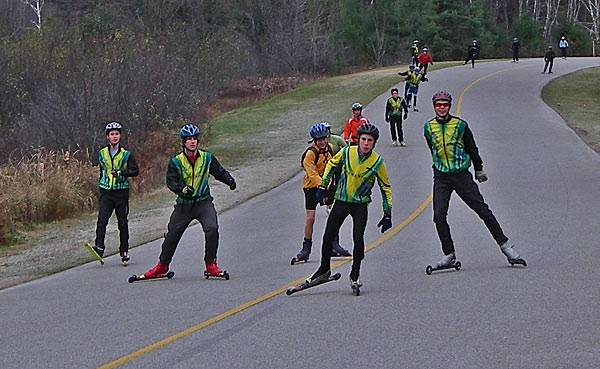 Nakkertok Racers chatting away while while gliding downhill on one ski